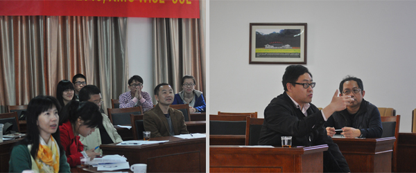 座谈会由本科国际化试点班项目负责人王学新博士和2011级班主任张晶博士主持,共有18组同学作研究课题展示,WISE教学研究人员方颖博士、傅十和博士、耿森博士、孟磊博士、牛霖琳博士、蔡立耑博士、赵敏强博士和外教Roslyn Bowers参与了此次研讨会并就各组所提出的研究课题展开探讨, 老师们对各个展示提出自己的建议和指导,有效地帮助同学们完善研究方法和研究方向,令同学们受益匪浅。而各位同学所做的课题中也不乏许多有趣的课题引发了老师和其他同学极大兴趣。