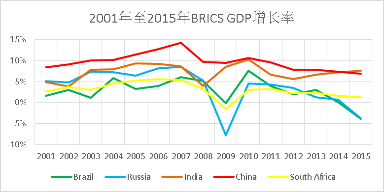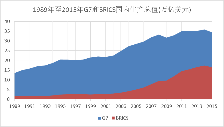但在2008年之后,金砖五国国内生产总值增长率下滑(见图1),其国内生产总值在近年来也并无赶超七国集团的迹象(见图2),在不同程度上都面对着严峻的国内国际局势:巴西在2016年9月经历了政权更迭,俄罗斯连续两年负增长,印度货币改革导致经济差于预期,中国进入经济稳增长的新常态,南非反对党两次对总统祖马发起“不信任投票”。高盛早在2015年9月就关闭了其运行四年的“金砖四国”基金,曾经被看好的新兴市场如今却被看衰。