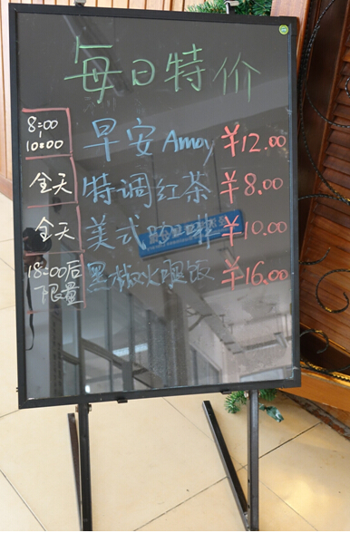 ( 位于“王亚南书院”咖啡屋门口的“每日特价”餐牌。)
