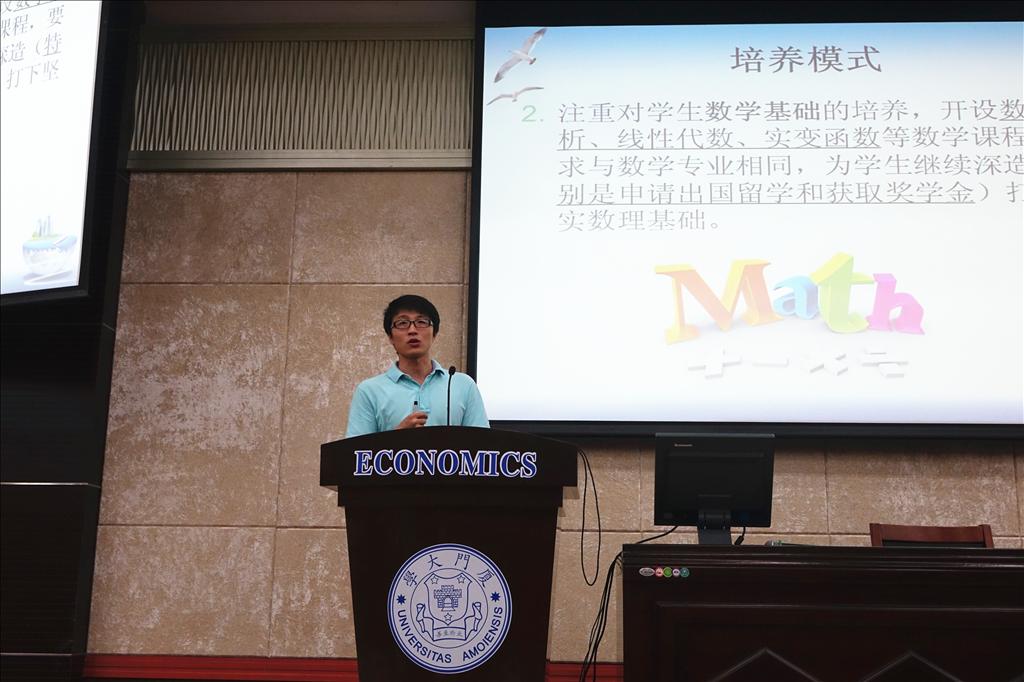 8月26日晚,bat365官网登录入口和王亚南经济研究院(WISE)合办的金融学、统计学和经济学本科国际化试点班2015级招生宣讲会在经济楼N402举行。宣讲会吸引了bat365官网登录入口500多名新生和学生家长到场听讲。两院教师郭晔、林明、牛霖琳、张烁珣、钟威以及两院教学管理人员陈烽、陈雅萍、林嘉、王晓微和WISE经济学本科国际化班的在读学生代表参加宣讲会并作项目介绍。