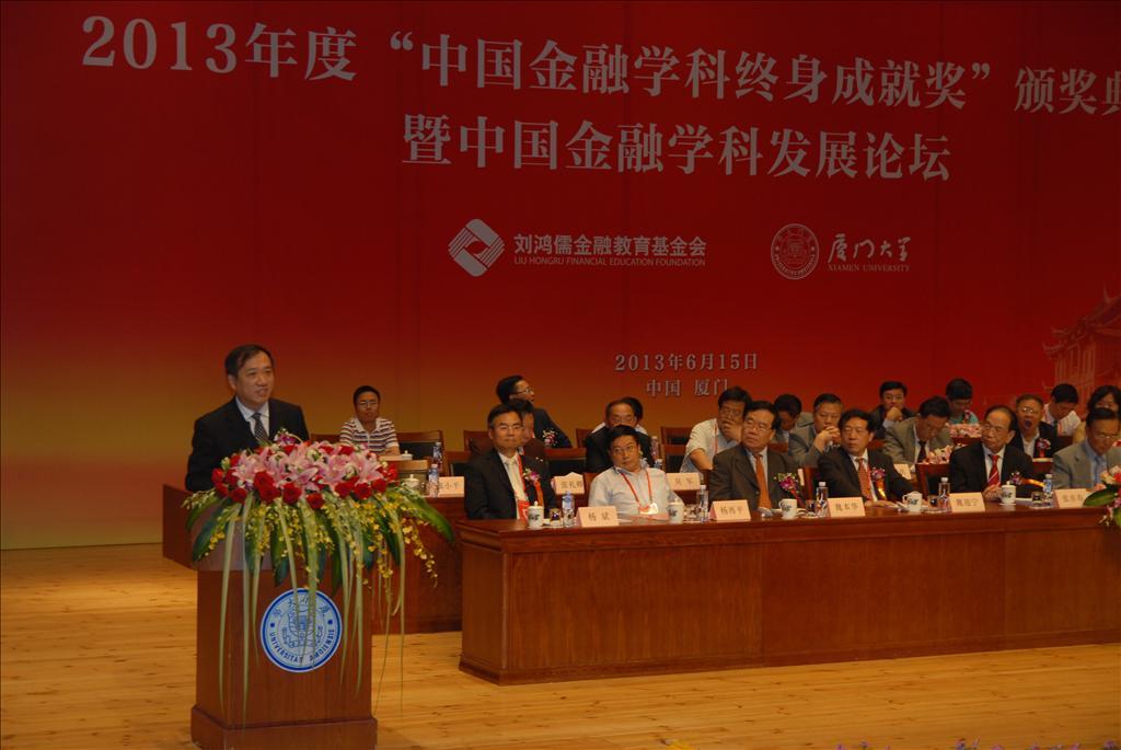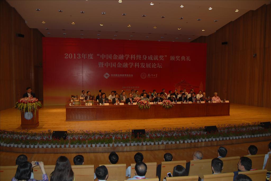 颁奖庆典于上午9:00开始,刘鸿儒金融教育基金会理事长魏本华先生宣布张亦春教授荣获2013年度“中国金融学科终身成就奖”。刘鸿儒金融教育基金会名誉理事长刘鸿儒先生和前保监会主席、中国保险保障基金会董事长魏迎宁先生分别为张亦春教授颁发获奖证书、奖牌。随后,张亦春教授作了真挚热情的获奖感言。张教授发言饱含深情和浓浓的感谢,已八十岁高龄的张教授说:“首先是感谢,但又不是一般的感谢,而是深———深———的感谢!”,并90度弯腰鞠躬!
