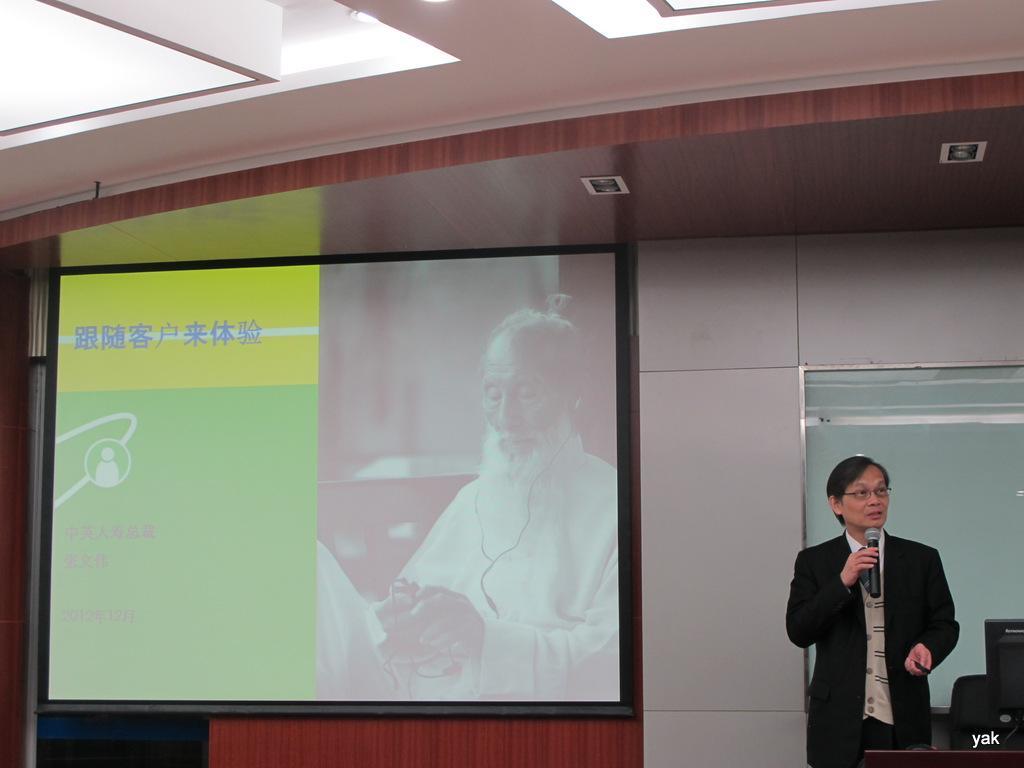 演讲一开始,张总裁首先向同学们解释了客户体验的含义,并举了星巴克和路易威登作为例子,意在向同学们说明倾听客户之声的重要性。随后,他也用宜家的例子说明盲目听从客户之声的危害。在谈到中英人寿的客户体验时,张总裁拿出了公司内部资料——一段由某外资管理咨询公司拍摄的中英人寿客户体验录像——来揭示中英人寿某分公司在客户关系管理上的不足之处。接下来,张总裁对比了在保险行业中几家主要公司的NPS(客户净推荐值)。通过比较,同学们可以清晰地看出中英人寿在客户关系管理上的明显优势和逐年提高的趋势。最后,张总裁用迪斯尼公司取得的辉煌成就鼓励同学们多学习客户管理知识,为改善中国保险行业的服务质量而努力。