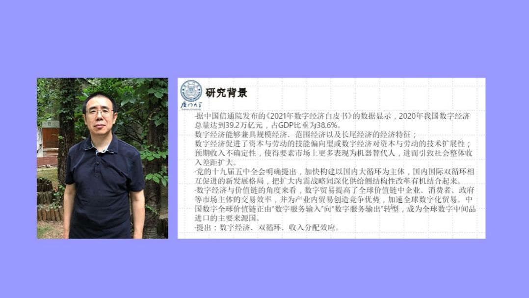 柏培文教授立足于数字经济与“双循环”新发展格局的双重宏观视角,对数字经济、双循环及其收入分配的因果效应进行了深入解释。基于研究结果,柏培文教授提出了三点政策建议:一是充分发挥以数字化、智能化为导向的数字经济的经济活力,进一步畅通国内大循环、国内国际双循环;二是打破数字经济对区域间双循环的市场分割、加大要素参与市场竞争的力度;三是在双循环的背景下,积极探索数字经济对地区收入差距缩小的路径,促进共同富裕。