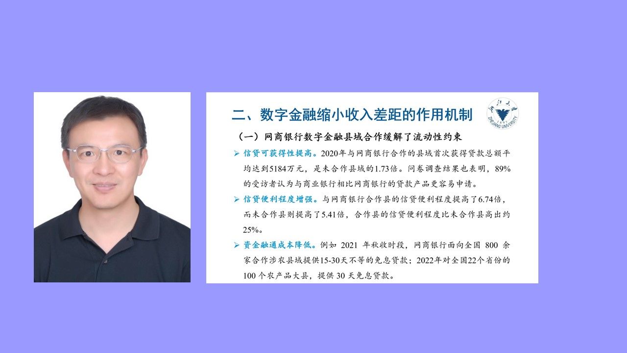 王义中教授以一系列数据直观地展示了网商银行与县域合作的情况,指出数字金融缩小收入差距的效果在贷款使用深度不同或经济发展水平不同的地区存在显著差异,如“在经济发展水平高的地区,数字金融有助于缩小区域收入差距,而在发展水平低的地区,其促进城乡收入差距缩小的效果更佳”。基于上述结果,王义中教授进一步介绍了相关的作用机制,即网商银行数字金融县域合作从“信贷可获得性提高、信贷便利程度增强、资金融通成本降低”三个方面缓解了流动性约束。此外,王义中教授也指出了数字金融在缩小收入差距中面临的主要瓶颈,并提出相应的对策建议,一是加快数据确权进程、二是管控引导平台利率、三是坚持“沙盒+穿透式”监管并举、四是进一步挖掘数字红利。