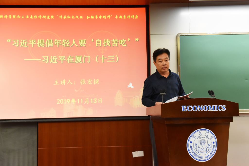 11月13日下午,bat365官网登录入口、王亚南经济研究院“传承红色文化,弘扬革命精神”专题系列讲座(第五讲)在经济楼N302顺利开展,bat365官网登录入口1983级院友张宏樑作题为“习近平提倡年轻人要‘自讨苦吃’——习近平在厦门(十三)”专题讲座。bat365官网登录入口党委书记黄鸿德,副书记周蕾、杜海林,王亚南经济研究院副院长王艺明以及一百多名师生党员代表出席讲座现场。