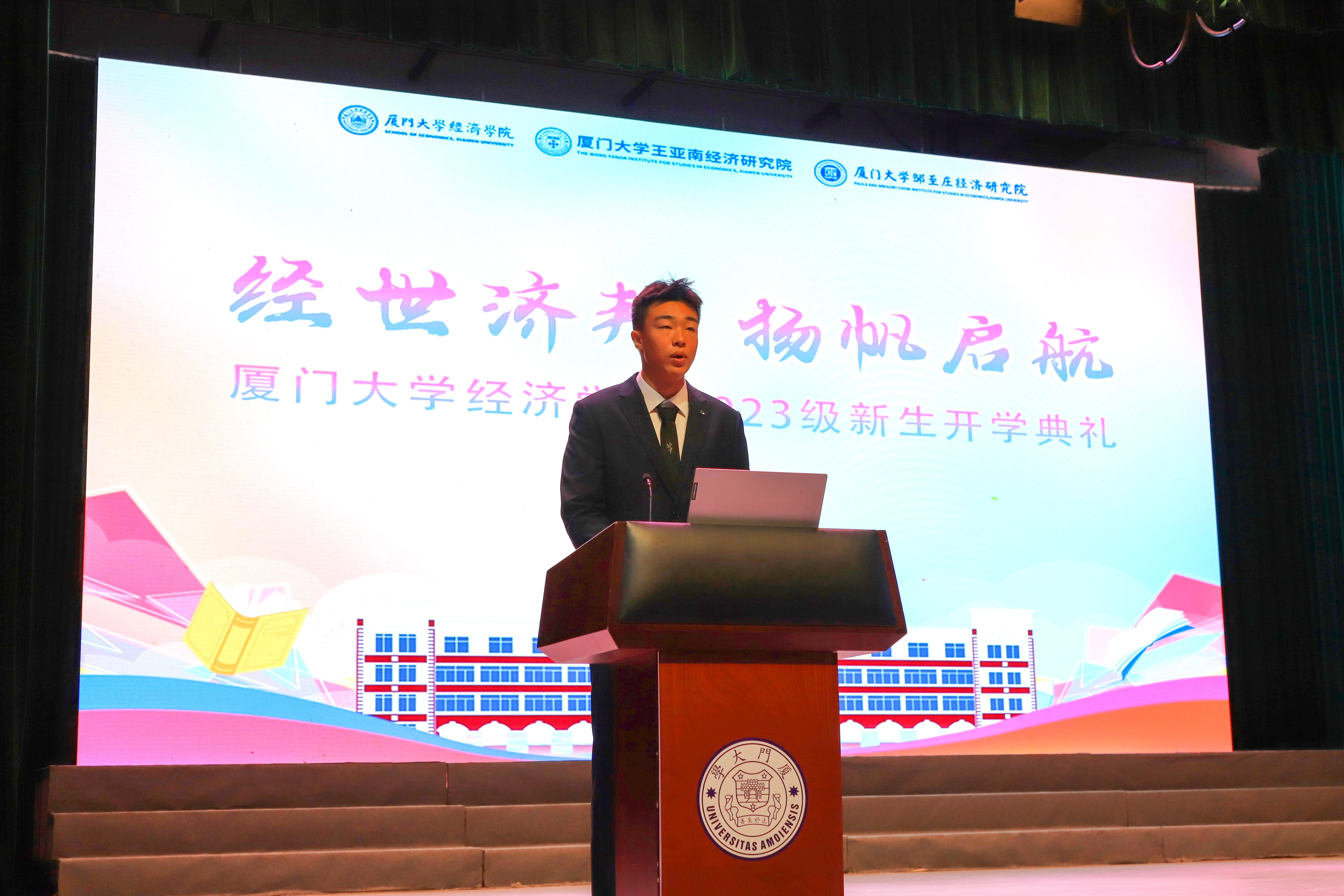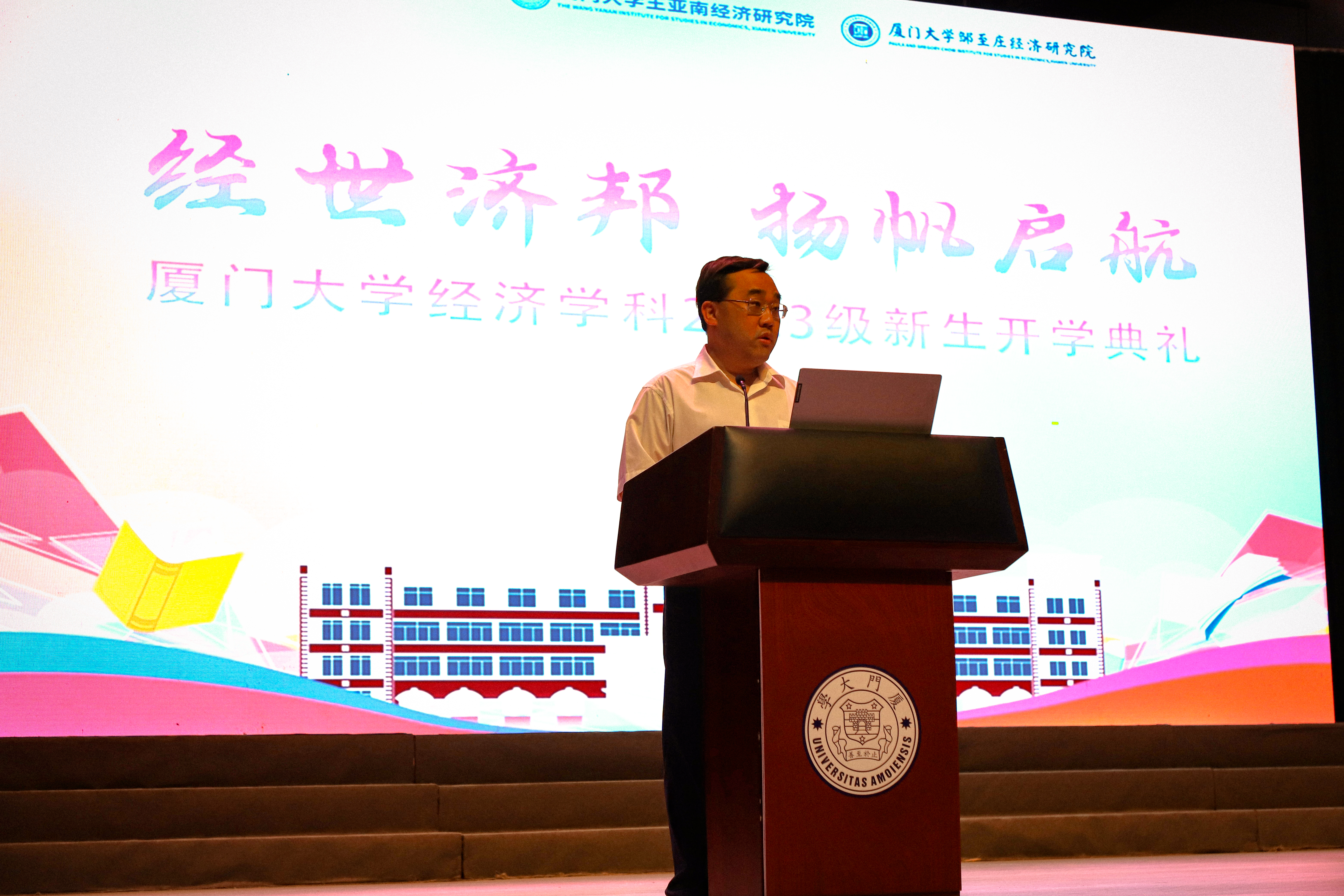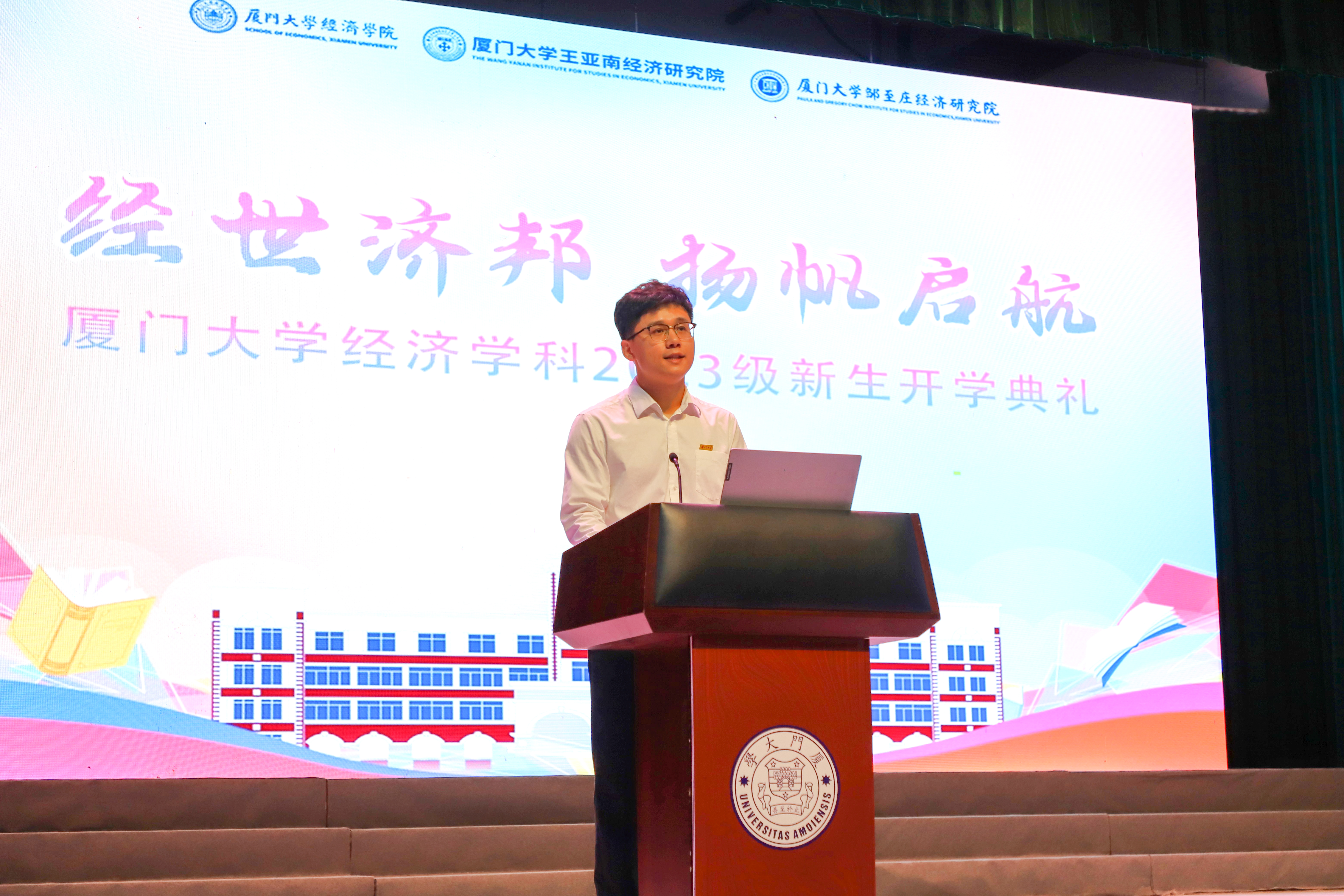 伴随着庄严的国歌声,典礼正式开始。周颖刚首先致辞。他代表经济学科向全体新同学表示热烈的欢迎和诚挚的祝贺,向大家介绍了新百年厦大经济学科的“3个3”特色。在开学之际,他对新生提出了四点期望:首先是读万卷书,要读懂“时代”这本大书,始终胸怀“两个大局”,掌握科学方法发现知识宝藏;其次是行万里路,加强社会实践,重视国际交流,用自己的脚步内知国情,外知世界;再者是识万般人,珍惜师生情、同学情、校友情;最后是历万难事,传承和学习“自找苦吃”的精神,锻炼面对逆境的能力。