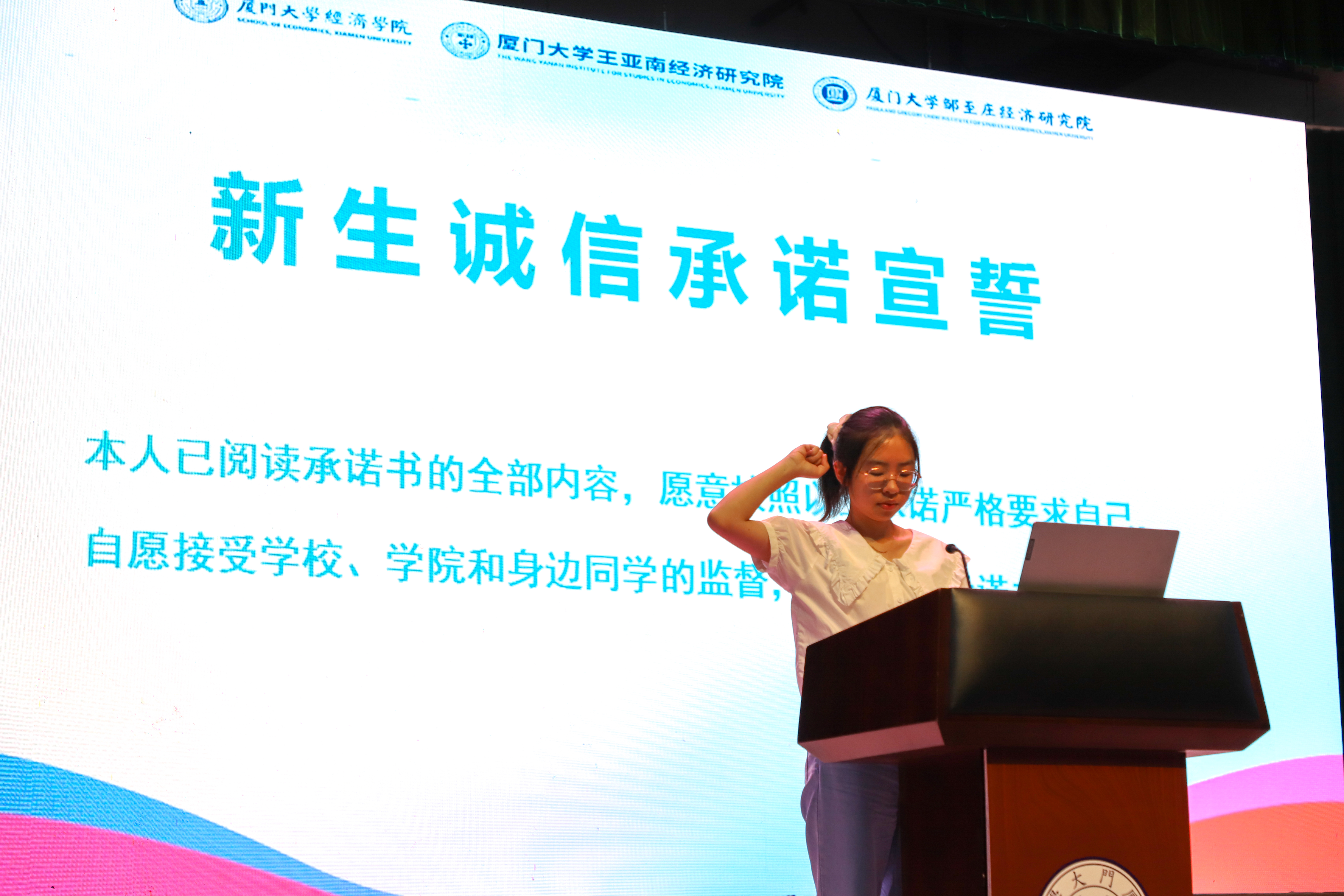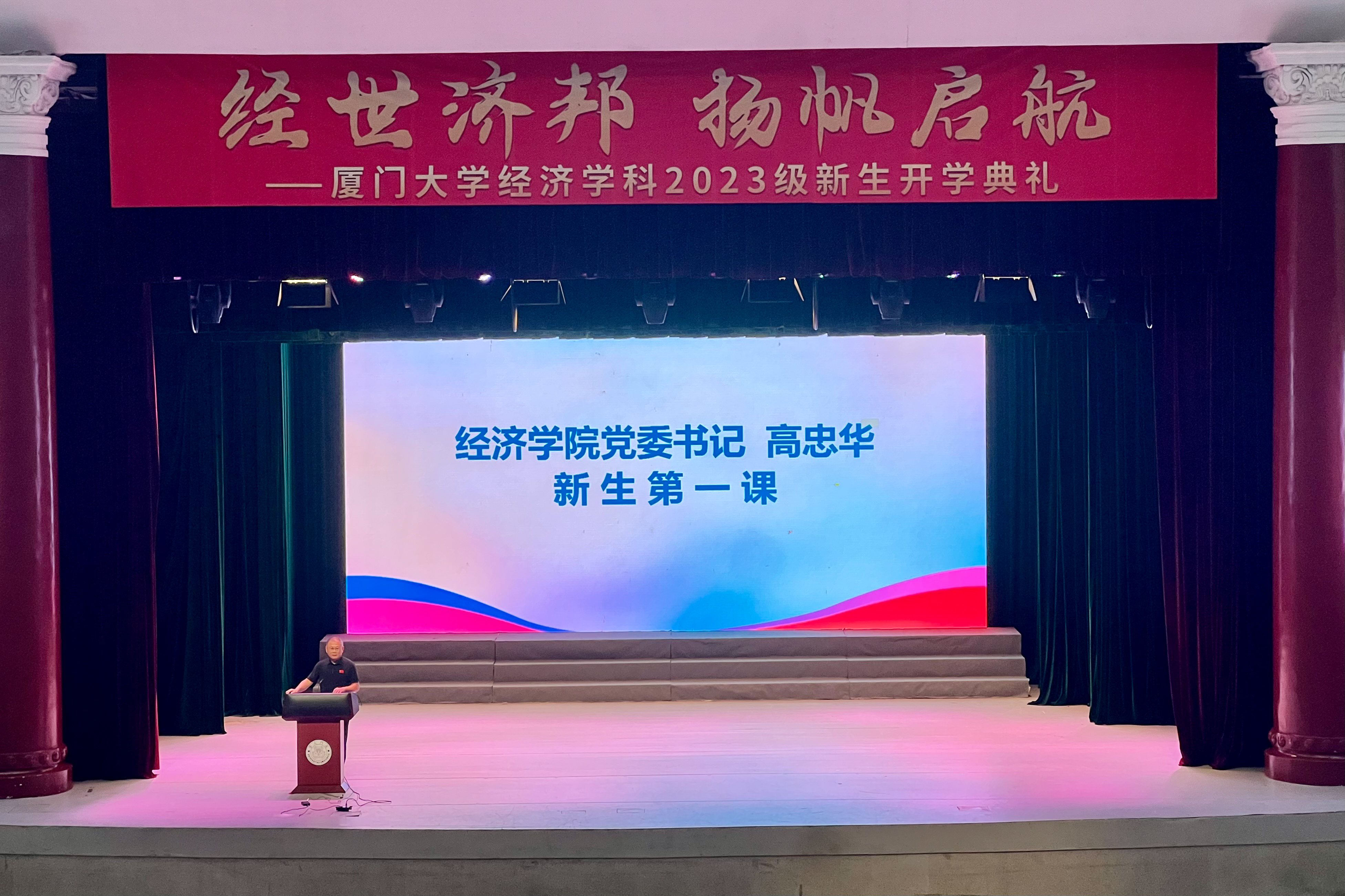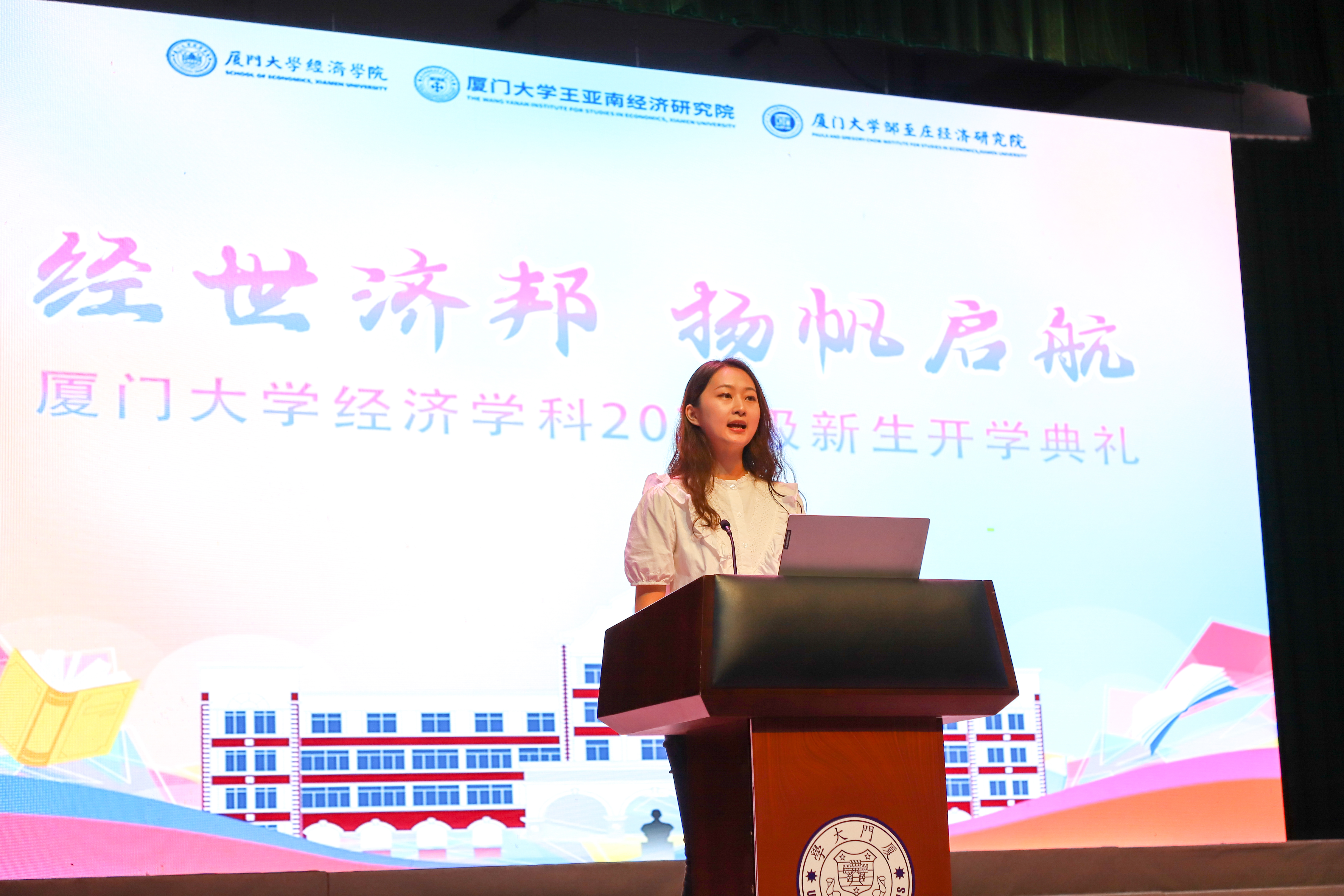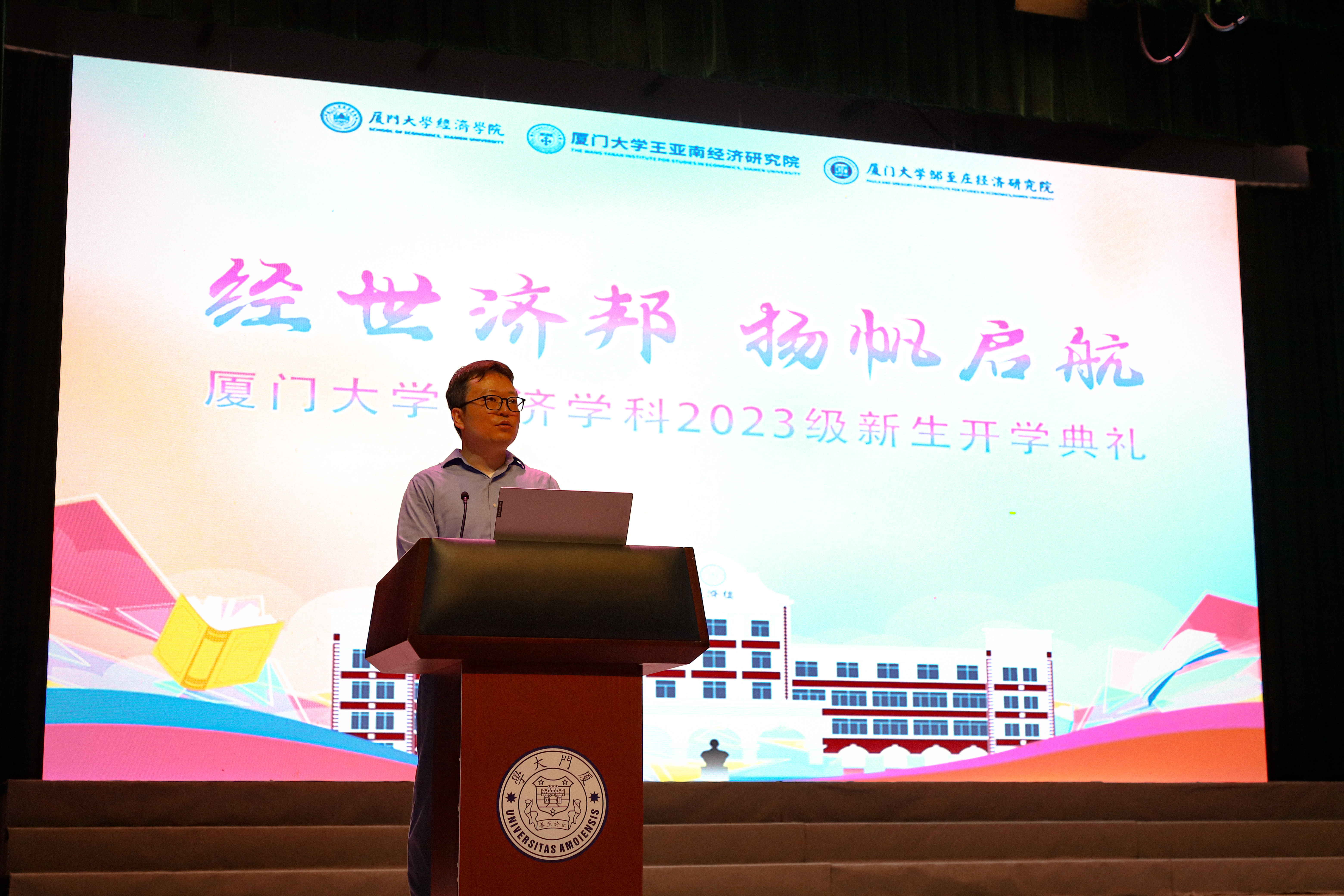 伴随着庄严的国歌声,典礼正式开始。周颖刚首先致辞。他代表经济学科向全体新同学表示热烈的欢迎和诚挚的祝贺,向大家介绍了新百年厦大经济学科的“3个3”特色。在开学之际,他对新生提出了四点期望:首先是读万卷书,要读懂“时代”这本大书,始终胸怀“两个大局”,掌握科学方法发现知识宝藏;其次是行万里路,加强社会实践,重视国际交流,用自己的脚步内知国情,外知世界;再者是识万般人,珍惜师生情、同学情、校友情;最后是历万难事,传承和学习“自找苦吃”的精神,锻炼面对逆境的能力。