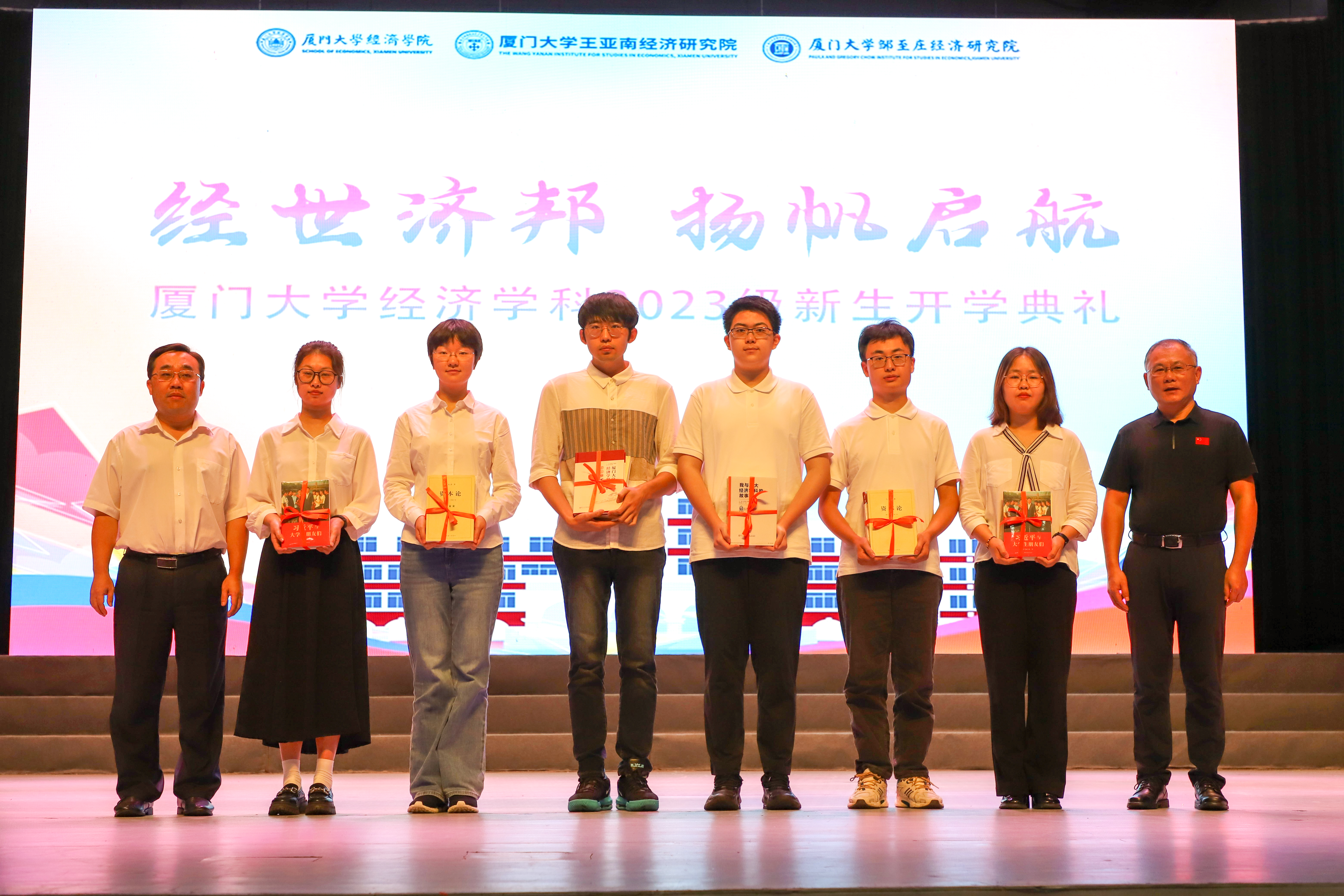 学院为 2023 级新生精心挑选了《资本论》《习近平与大学生朋友们》《bat365官网登录入口经济学科(百年史)》《我与厦大经济学科的故事》四本书,以帮助新生了解时代、了解学科、了解自己。典礼上,高忠华、周颖刚为新生代表赠书并合影留念。