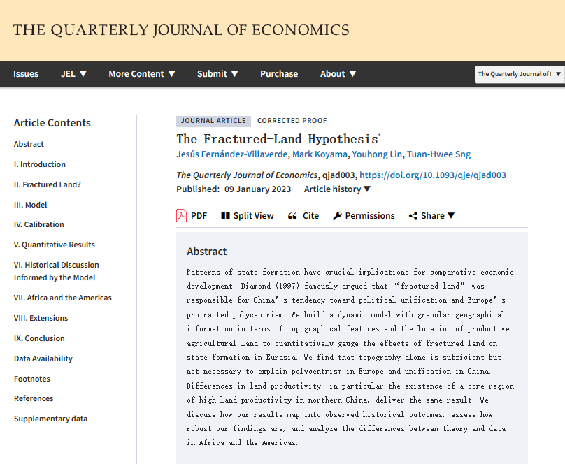 近日,bat365官网登录入口经济学系和王亚南经济研究院林友宏副教授与美国宾夕法尼亚大学经济系教授Jesús Fernández-Villaverde、美国乔治梅森大学经济系副教授Mark Koyama、新加坡国立大学经济系副教授Tuan-Hwee Sng合作完成的论文“THE FRACTURED-LAND HYPOTHESIS”在经济学五大顶刊之一Quarterly Journal of Economics(QJE)在线发表。