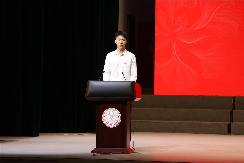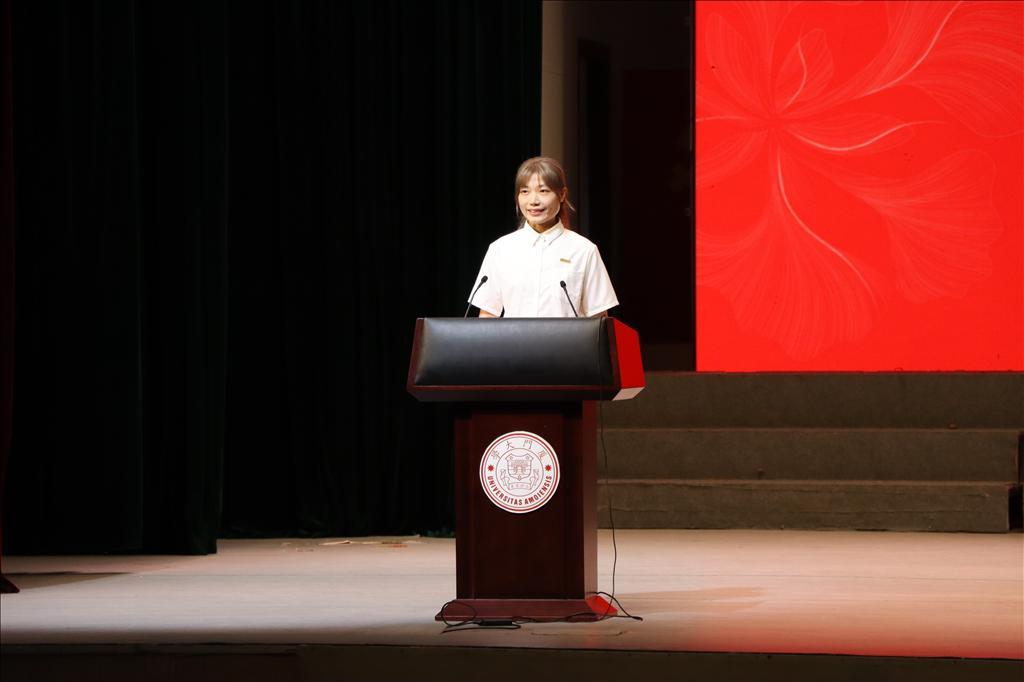 “在大学,我们不只是学习书本知识,更重要的是成为一个更完整的人。”老生代表、王亚南经济研究院2019级本科生楼帅舟分享了两年大学生活体会,将“学会自主学习、学会拥抱孤独、学会承担责任”与新生共勉。号召新生勇于承担时代责任,要追真正的“星”,“以中国人的立场去建设新中国的经济学”。