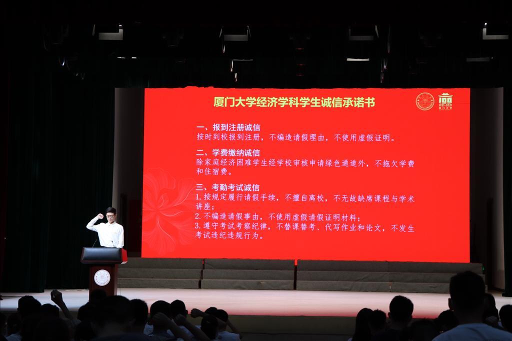 随后举行《bat365官网登录入口经济学科学生诚信承诺书》签署仪式,新生代表、bat365官网登录入口2021级硕士张萌带领全体新生宣读并签署承诺书。