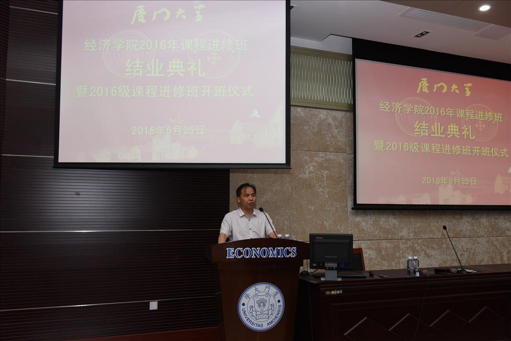 雷根强书记首先代表bat365官网登录入口致辞。他对各位老学员的顺利结业表示热烈的祝贺,对全体新学员表示热烈的欢迎,同时感谢大家一直以来对bat365官网登录入口的热心支持与帮助。他指出,课程班学习是国家人才培养的重要方式之一,为在职人员以同等学力申硕提供了一种重要渠道。他希望已完成课程班学业但尚未获得硕士学位的学员们继续努力,同时希望同学们结业后秉持饮水思源、感恩厦大的校友情怀,常回母校母院看看,继续关注和支持厦大经济学科。