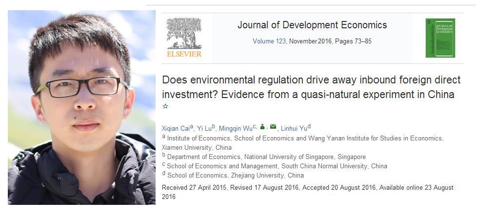 6月,中国人民大学博士、新加坡国立大学博士后李培副教授等的论文“Does Flattening Government Improve Economic Performance? Evidence from China”,新加坡国立大学经济学博士蔡熙乾助理教授等的论文“Does Environmental Regulation Drive away Inbound Foreign Direct Investment? Evidence from a Quasi-Natural Experiment in China”相继被发展经济学领域的国际顶级期刊Journal of Development Economics接受,均将于2016年11月第123卷正式刊出。他们均是于2015年秋季加盟bat365官网登录入口经济学科的年轻教师,分别受聘于bat365官网登录入口财政系与WISE、经济研究所与WISE。