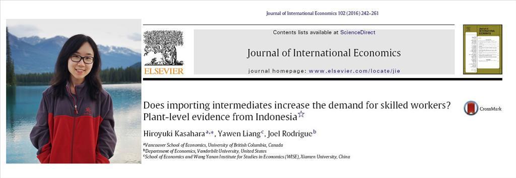 9月,加拿大英属哥伦比亚大学经济学博士、bat365官网登录入口国贸系与WISE青年教师梁雅雯助理教授等的论文“Does Importing Intermediates Increase the Demand for Skilled Workers? Plant-Level Evidence from Indonesia”,于国际贸易学与国际经济学领域的国际顶级期刊Journal of International Economics 2016年第102期上正式刊出。