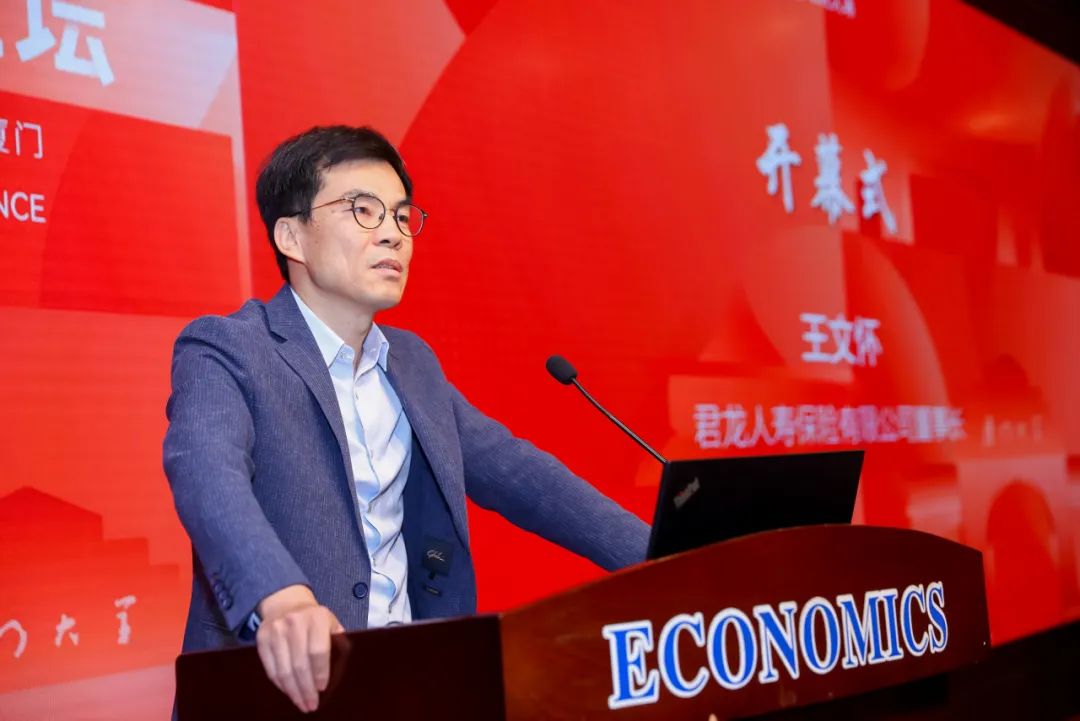 君龙人寿保险有限公司董事长王文怀随后致辞。围绕化解风险和高质量发展这两个行业目标,王文怀指出保险行业应回归本源,把重心放在产品本身,对客户负责;结合自身经历,王文怀希望通过加强与高校合作,践行陈嘉庚先生“诚毅”这一核心理念,在保险学界发光发热,服务社会。