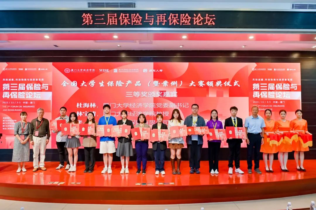 杜海林副书记、林宝清教授与君龙人寿保险有限公司消费者权益保护部负责人张弩为三等奖获得者代表颁奖