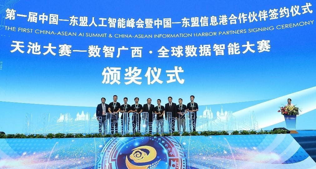 最后,在第一届中国-东盟人工智能峰会上,由阿里巴巴集团副总裁李树翀等为获奖团队颁奖。