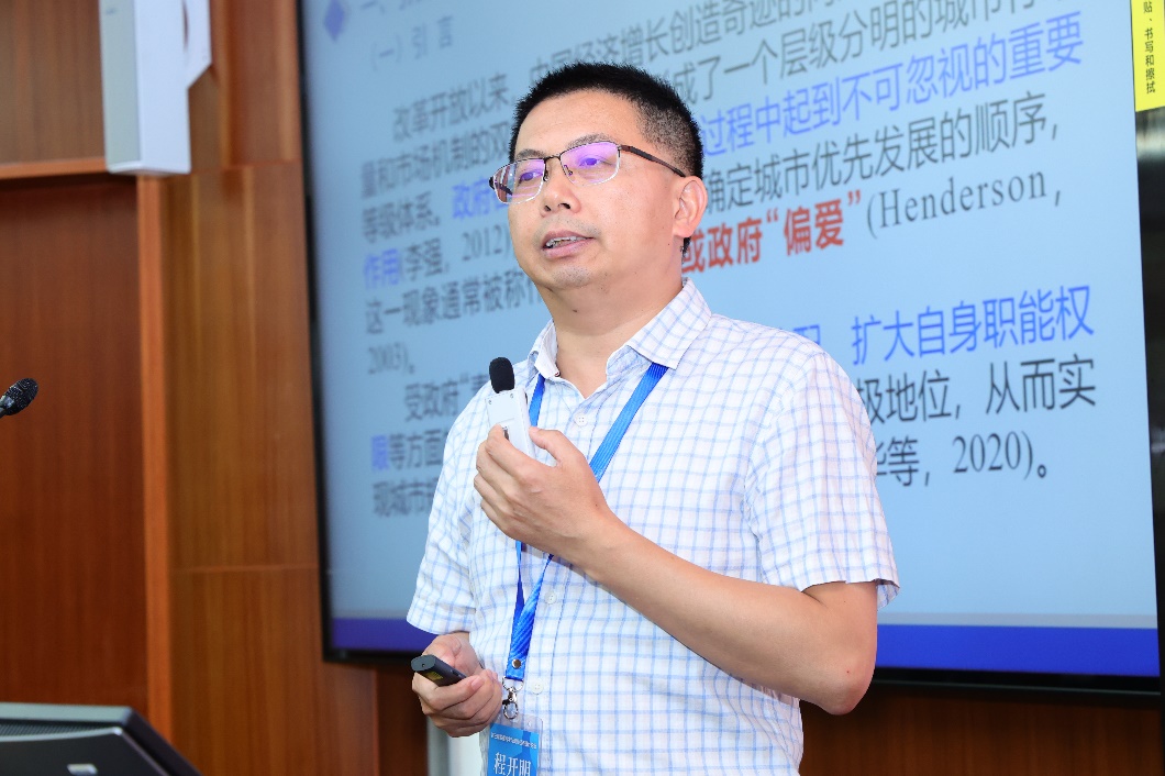 程开明教授报告了其关于受政府“青睐”的城市是否具有更高创新绩效的研究成果。该研究结合城市级别与开发区获批资料来综合判定城市是否受到上级政府“青睐”,利用2004-2018年城市是否受政府“青睐”而建设开发区作为准自然实验,并构建PSM-DID模型以识别因果效应,发现城市在省级开发区建设中获得的省政府“青睐”优势显著推动了城市创新。