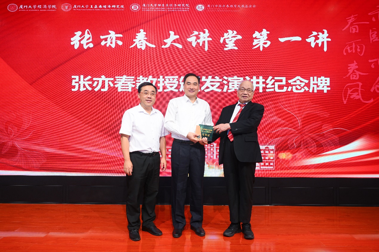 随后,周颖刚教授主持张亦春大讲堂第一讲,张亦春教授为主讲嘉宾生柳荣博士颁发演讲纪念牌。张亦春大讲堂是张亦春基金会在经济学科设立的系列讲座,将邀请各界优秀代表及权威人士分享他们的研究成果和实战经验。
