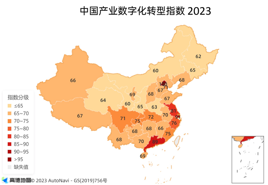 从综合指数地图来看,我国产业数字化转型出现较明显的区域聚集性。北京的产业数字化转型程度排在第一位,显著高于其他地区,而经济比较发达的长三角、珠三角等东部地区产业数字化转型程度普遍较高,长江经济带的发展也令人瞩目。
