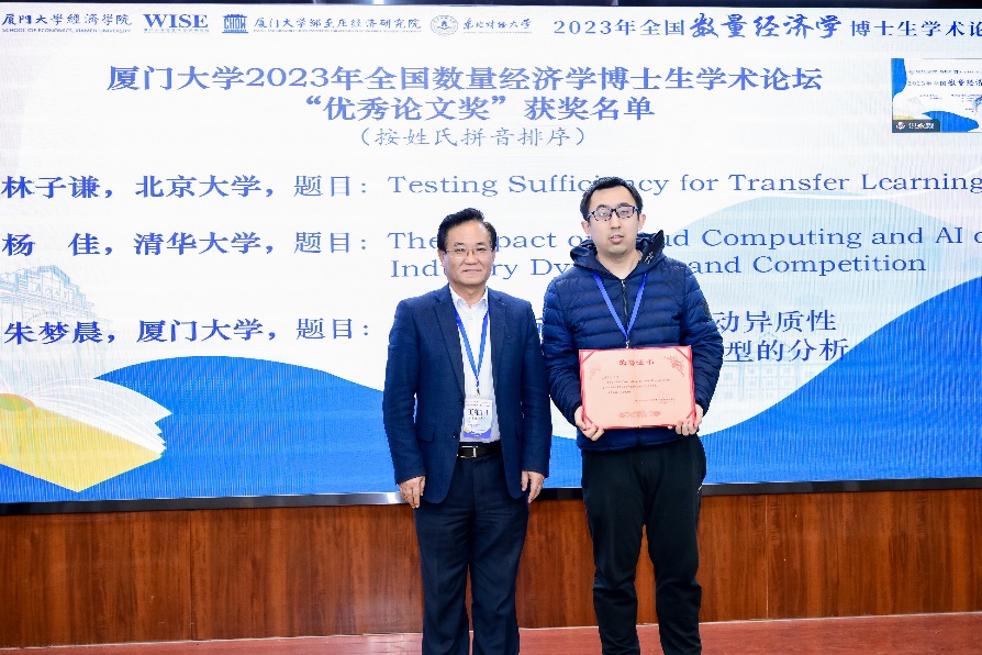 17日上午,优秀论文奖颁奖仪式在厦大经济楼举行,bat365官网登录入口王亚南经济研究院副教授赵敏强主持仪式。本次论坛将投稿文章分为三大类:计量统计类、金融类和经济类。北京大学林子谦获计量统计类优秀论文奖;清华大学杨佳获得金融类优秀论文奖;bat365官网登录入口朱梦晨获得经济类优秀论文奖。王维国、邱嘉平、齐鹰飞分别为获奖同学颁奖。