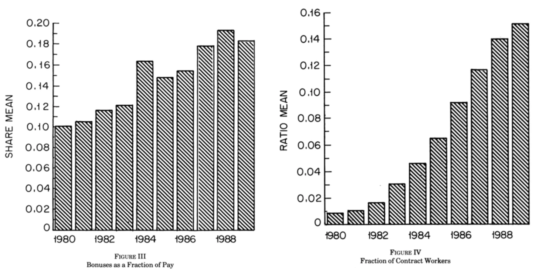 在1980年代,中国政府对国有企业在不改变所有制的前提下引进了一些重要改革,其中包括两个激励改革:一是引入奖金制度,二是变终身职为合同工。经济激励理论预言,这些激励措施将提高工人劳动积极性,从而提升企业劳动生产率。
