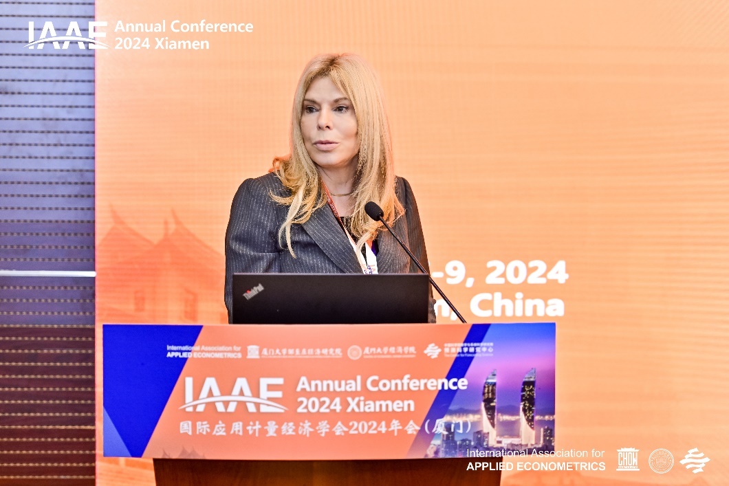 随后,国际应用计量经济学会董事会成员Marcelle Chauvet教授代表IAAE致辞。她谈到,能够在中国召开IAAE年会可谓夙愿得偿,很感谢洪永淼教授及主办方各单位对本次会议召开做出的努力,希望IAAE学会今后能跟中国学界有更多的交流机会。随后,她简要介绍了IAAE学会的规模,并预祝本次年会圆满成功。