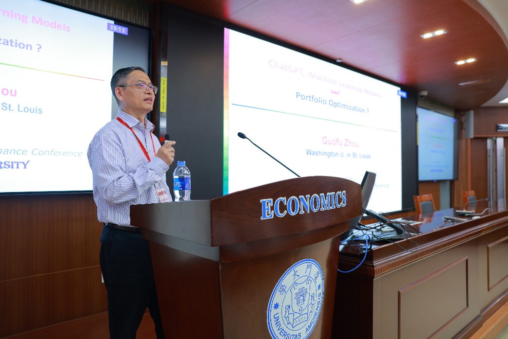 29日上午,美国圣路易斯华盛顿大学周国富教授带来了题为“ChatGPT, ML Models and Portfolio Optimization”的主旨演讲。他首先从AI历史上的几次突破引入主题,总结了机器学习相较于传统模型在处理高维变量和解释政策效果方面的优越性。接着他重点介绍了机器学习在金融预测方面的应用。