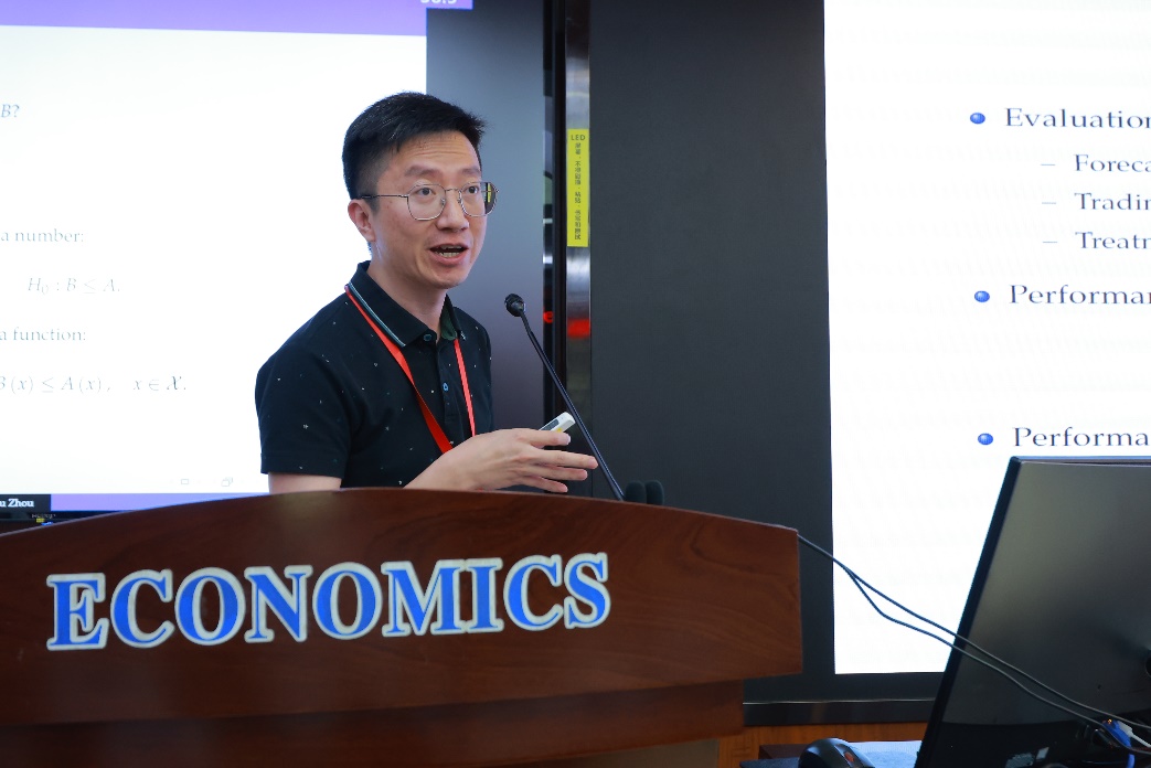新加坡管理大学李嘉教授带来了题为“A General Test for Functional Inequalities”的主旨演讲。首先提出金融研究中的一个常见问题:如何评估和比较不同资产组合策略的表现?他指出,在实际研究中,我们通常需要比较在不同状态(state)下的表现函数,而该函数通常为组合的夏普比率。