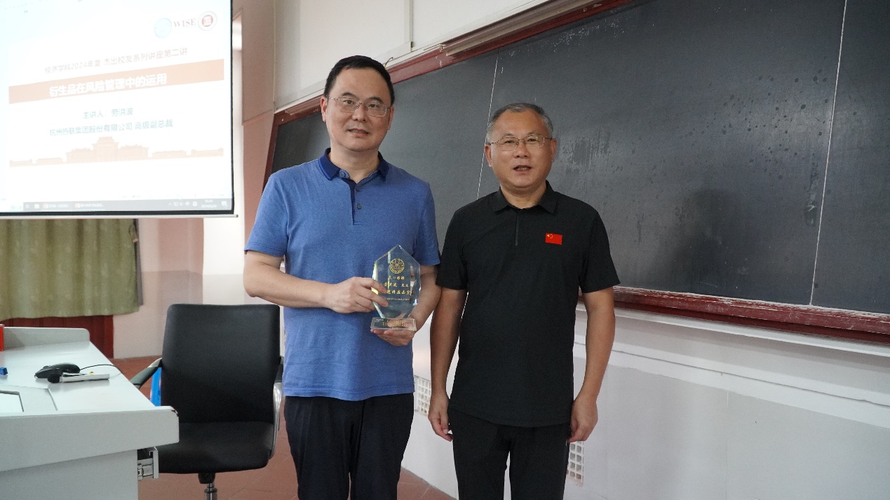 6月28日下午,厦大经济学科2024年夏季学期杰出校友系列讲座第二讲在群贤二102教室顺利举行,热联集团高级副总裁、中金协风险管理专委会会长劳洪波应邀作了题为“衍生品在风险管理中的应用”的精彩讲座。bat365官网登录入口党委书记高忠华出席讲座并为主讲人颁授讲座纪念牌。