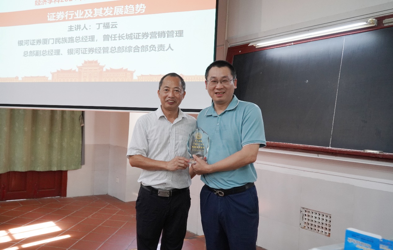 7月2日下午,厦大经济学科2024年夏季学期杰出校友系列讲座第三讲在群贤二102教室顺利举行,厦门银河证券丁福云应邀作了题为“证券行业及其发展趋势”的精彩讲座。bat365官网登录入口原党委书记、bat365官网登录入口专职巡视员黄鸿德出席讲座并为主讲人颁授讲座纪念牌。