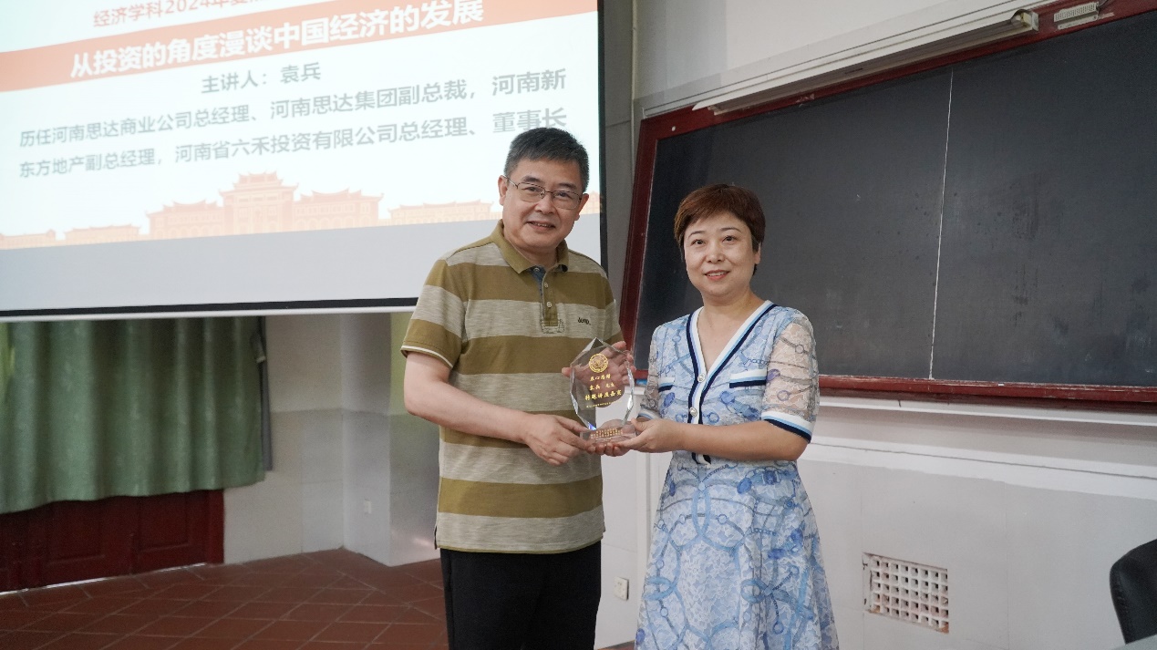 7月5日下午,厦大经济学科2024年夏季学期杰出校友系列讲座第四讲在群贤二102教室顺利举行,河南省六禾投资有限公司总经理、董事长袁兵应邀作了题为“从投资的角度漫谈中国经济的发展”的精彩讲座。bat365官网登录入口党委副书记李静主持讲座,并为袁兵颁授该系列讲座纪念牌。