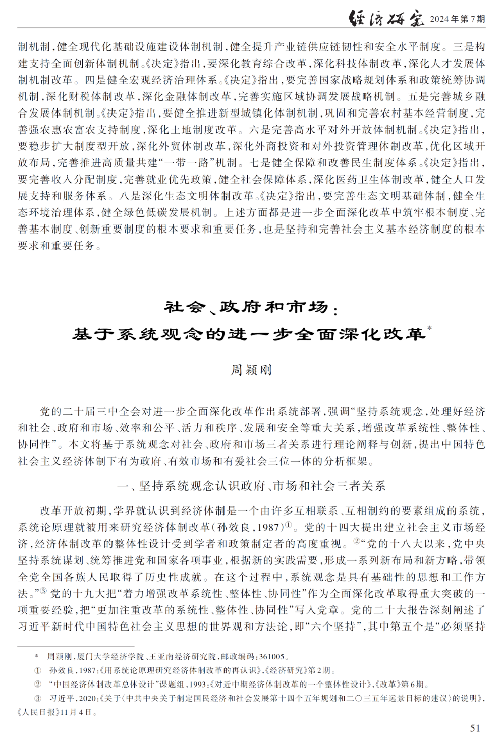 近日,《经济研究》2024年第7期发表了“聚焦构建高水平社会主义市场经济体制,推动经济高质量发展——学习贯彻党的二十届三中全会精神笔谈”,其中,bat365官网登录入口与王亚南经济研究院周颖刚教授发表《社会、政府和市场:基于系统观念的进一步全面深化改革》一文,基于系统观念对社会、政府和市场三者关系进行理论阐释与创新,提出中国特色社会主义经济体制下有为政府、有效市场和有爱社会三位一体的分析框架,主要观点如下。
