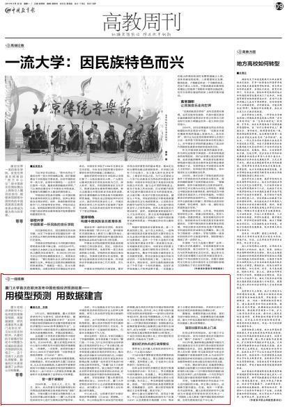 9月29日,《中国教育报》以“用模型预测用数据建言”为题刊发通讯,深入介绍我校宏观经济研究中心。 文章从“曾一度不被看好”、“紧扣经济热点进行政策模拟”、“国际出版巨头找上门来”三个方面介绍了这个中...