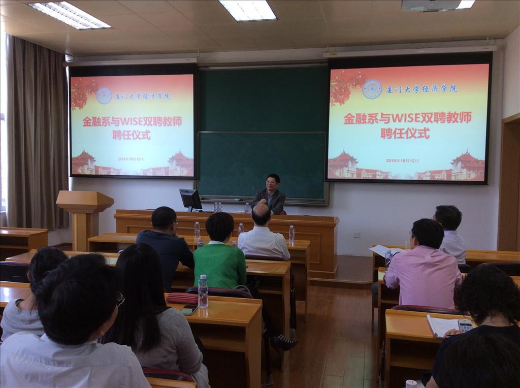 10月12日下午3:00,“金融系与WISE双聘教师聘任仪式”在经济楼D335准时开始。出席仪式的有:洪永淼、朱孟楠、郭晔等20余位老师以及金融系博士生。仪式由蔡伟毅老师主持。 蔡伟毅老师首先介绍了本次双聘教...