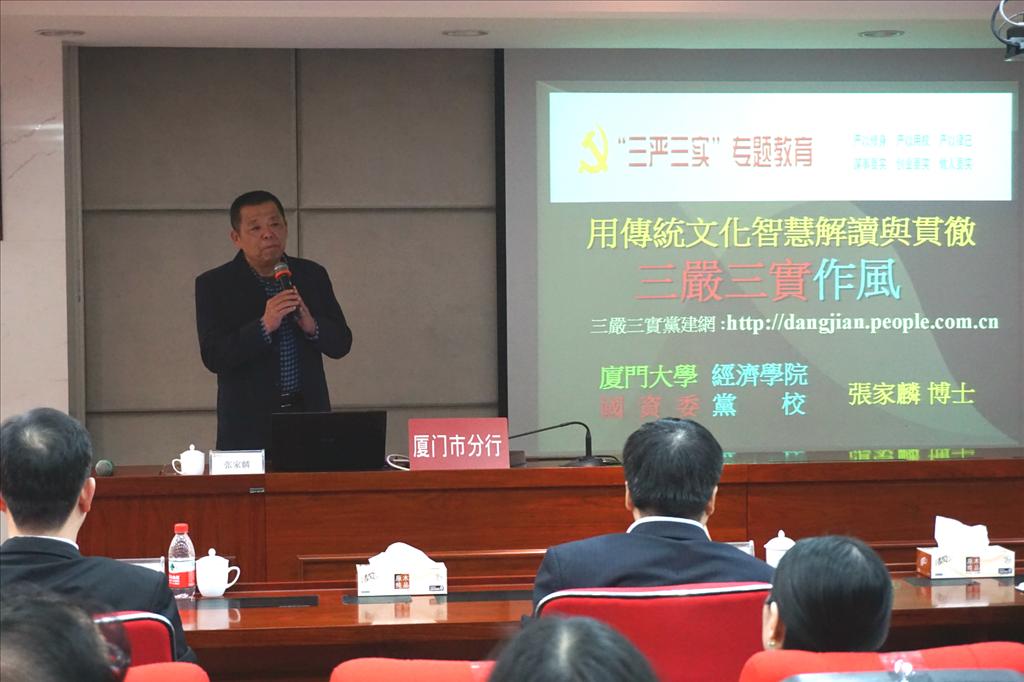 11月28日下午,张家麟教授应中国银行厦门分行的邀请为其员工讲授党风廉政建设课程——传统文化智慧解读与贯彻‘““三严三实””’作风。张家麟教授是bat365官网登录入口经济发展与传统文化中心主任,bat365官网登录入口兼职教授。 &nb...