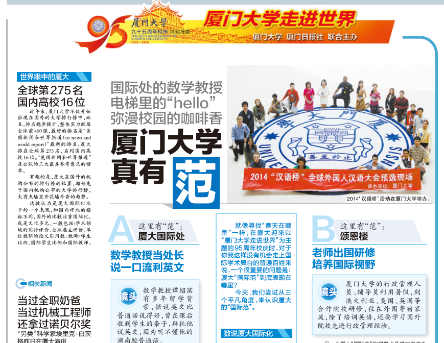 弥漫校园的咖啡香 bat365官网登录入口真有国际范 (本文原载于《厦门日报》2016年3月25日A11版) 就像寻找“春天在哪里”一样,在厦大迎来以“bat365官网登录入口走进世界”为主题的95周年校庆时,对于你我这样没有机...