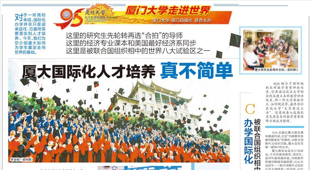 厦大国际化人才培养真不简单 (本文原载于《厦门日报》2016年3月31日A07版) 这里的研究生先轮转再选“合拍”的导师 这里的经济专业课本和美国最好经济系同步 这里是被联合国组织相中的...