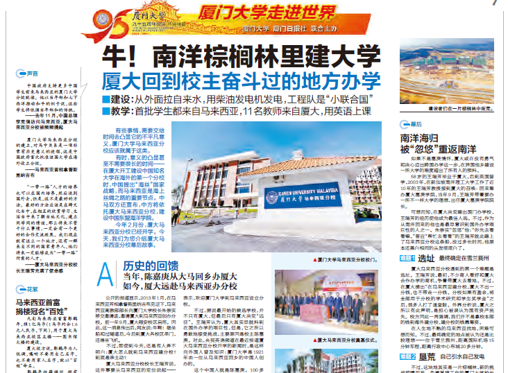 牛!南洋棕榈林里建大学 厦大回到校主奋斗过的地方办学 (本文原载于《厦门日报》2016年3月29日A07版) 建设:从外面拉自来水,用柴油发电机发电,工程队是“小联合国” 教学:首批学...